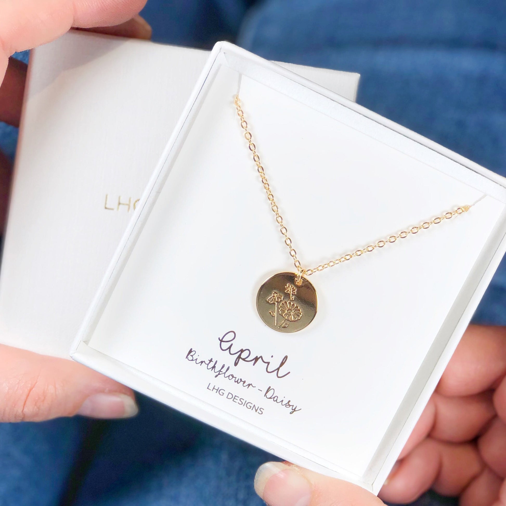 The delicate Daisy flower is engraved onto a 1.5 cm pendant and comes complete with a gold foil printed card and gift box.