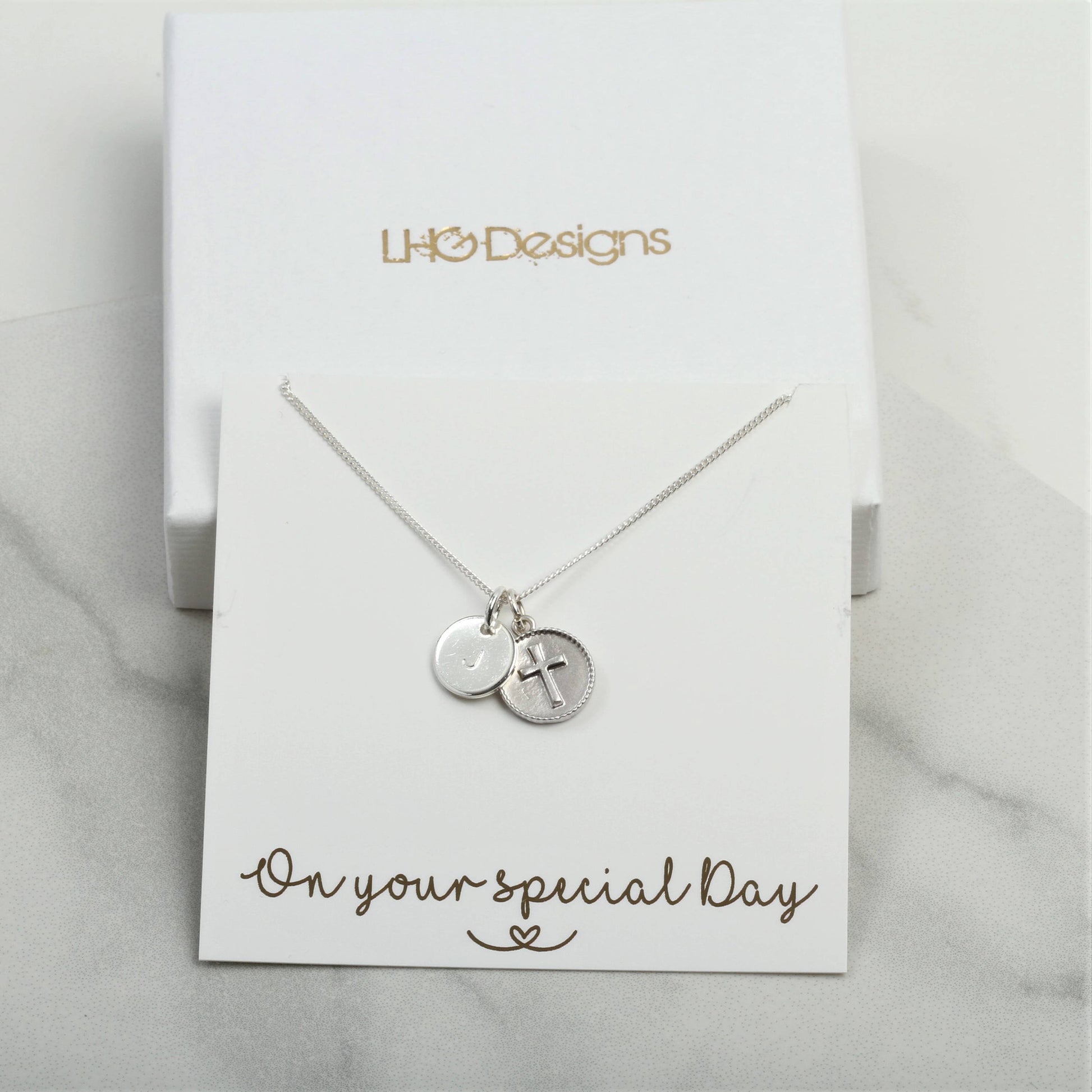 Christening or First Holy Communion gift for girls. Sterling Silver Cross pendant necklace with personalised initial charm.