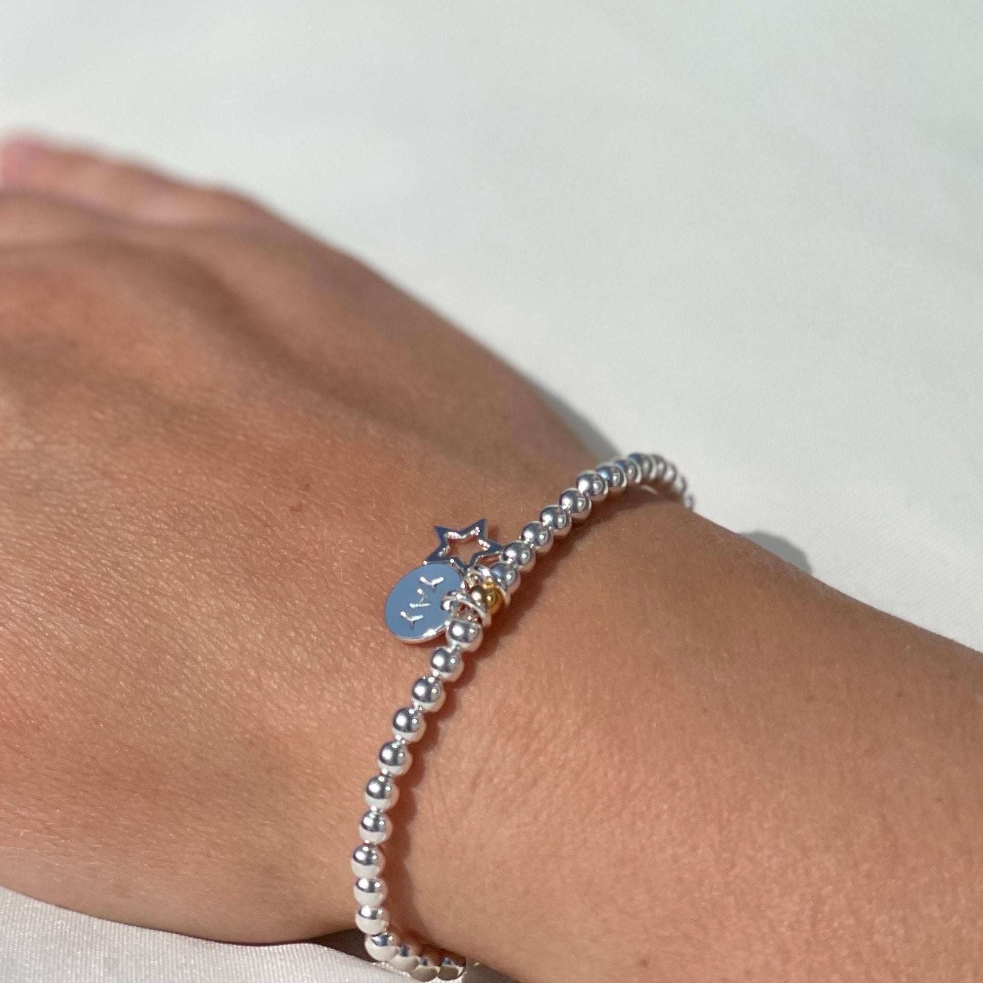 This bracelet has been hand-threaded with silver round beads and an accent gold bead. The bracelet is finished off with an adorable little star charm taking centre stage, along side a hand stamped initial disc tag.