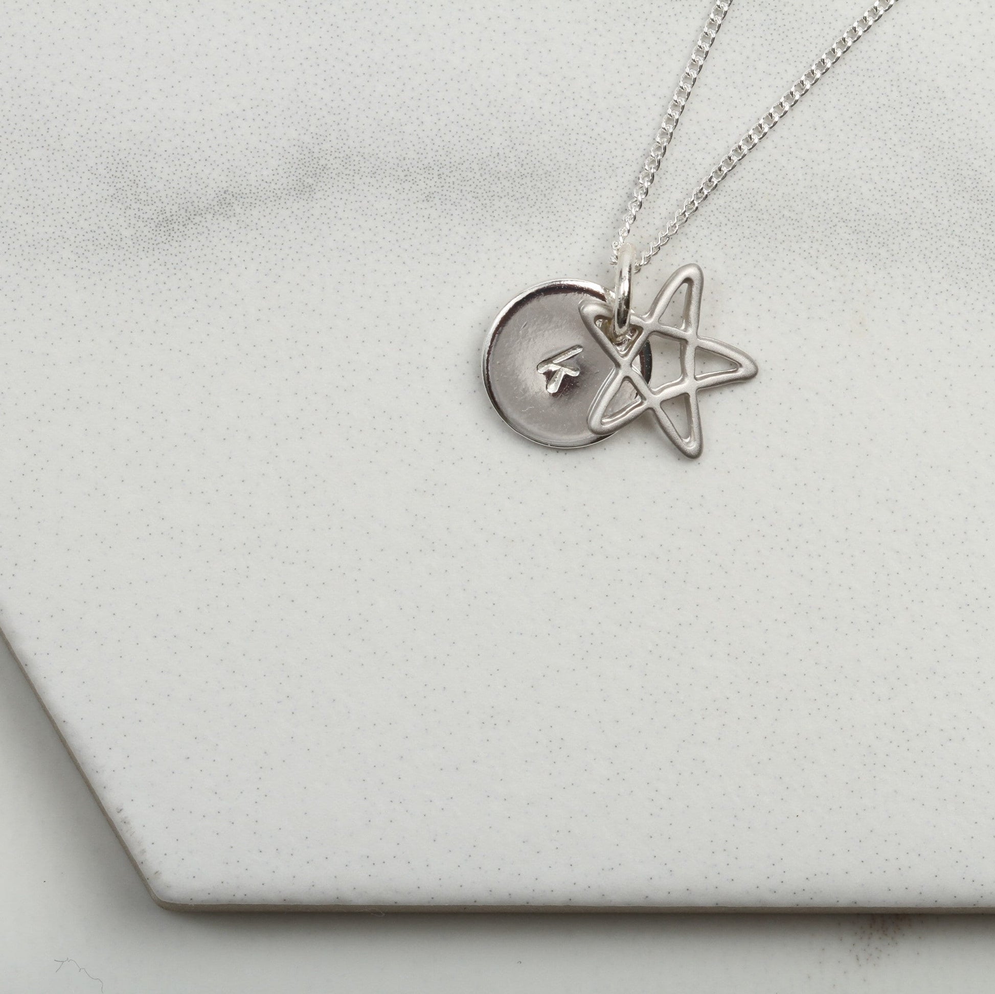 A beautiful disc and star pendant necklace which is personalised with up to 3 letters of your choice. Hand crafted in our studio, it’s a visual celebration of your love to that special person.