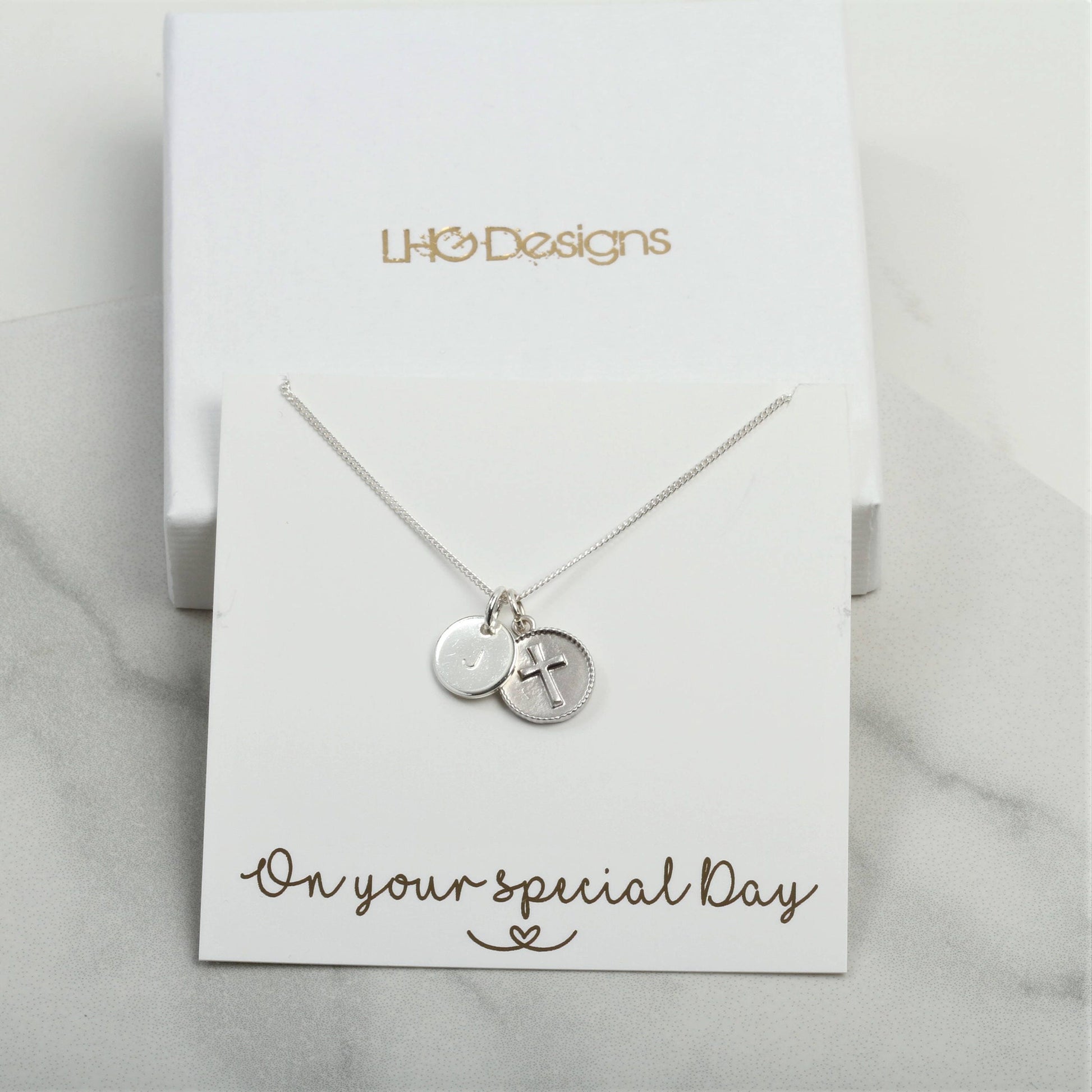 Christening or First Holy Communion gift for girls. Sterling Silver Cross pendant necklace with personalised initial charm. Beautifully handmade Sterling Silver Chain with Rhodium plated Matt finish embossed cross pendant and personalised silver plated disc necklace. Unusal design which features a disc pendant in matt silver rhodium plated embossed with cross. Necklace length for children is typically 14", 16" or 18" Gift boxed FREE. ADD A GIFT CARD - made from: Sterling silver Chain, Rhodium Plated Matt silver cross pendant, Silver Plated personalised disc pendant dimensions: 1.1 x 1.8 x 0.2 cm pendant