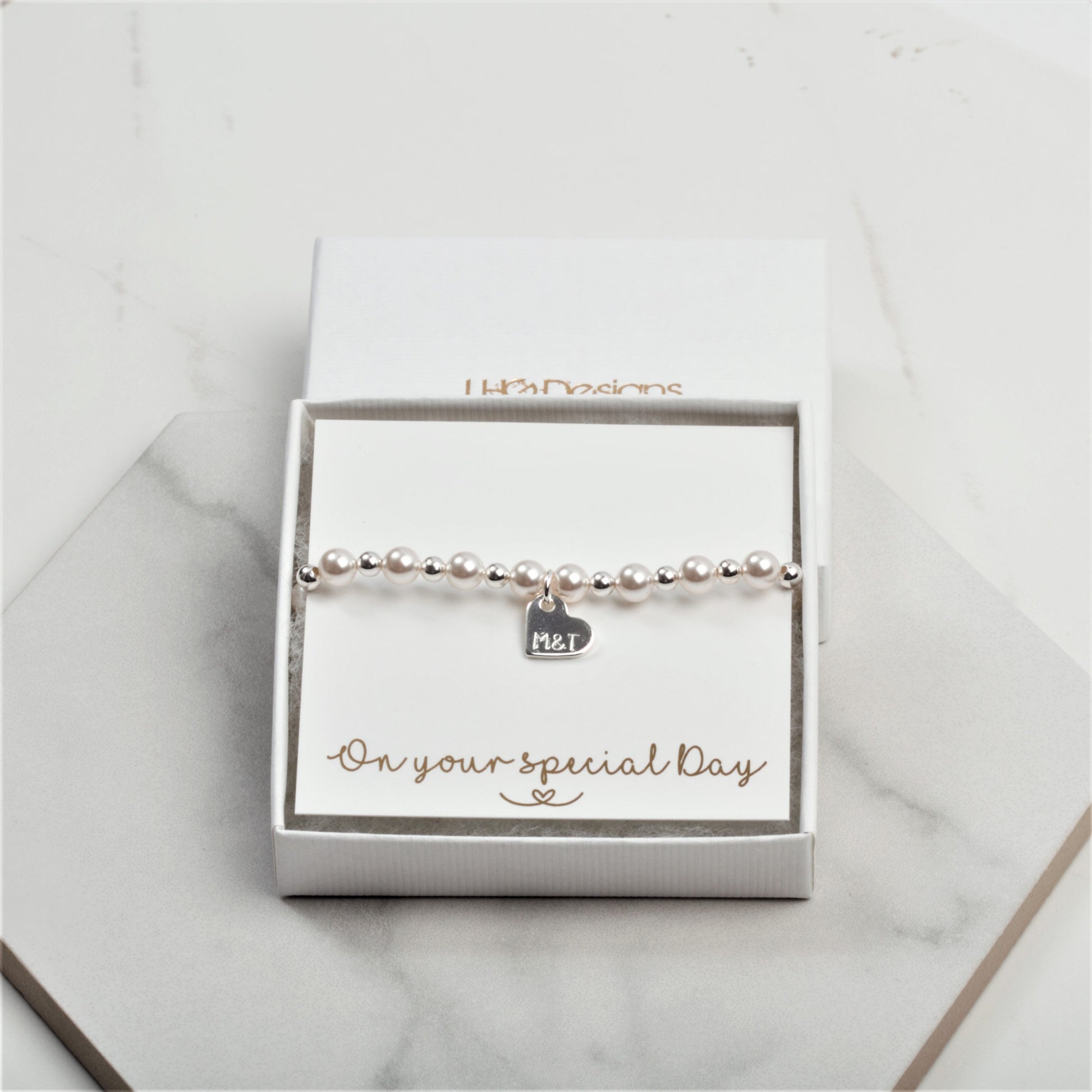 Beautiful swarovski Pearl bracelet with accent silver beads and personalised heart tag. Ideal gift for bride to be, bridesmaids, communions and anniversary gifts.